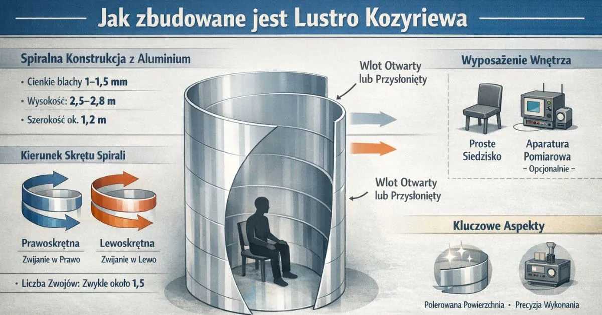 Z dostępnych opisów patentowych oraz relacji literaturowych wynika, że podstawowym elementem lustra Kozyriewa jest spiralna konstrukcja wykonana z polerowanego aluminium. Najczęściej stosuje się cienkie arkusze metalu o grubości rzędu około 1–1,5 mm, które są odpowiednio wyginane, aby utworzyć ciągłą, gładką powierzchnię bez ostrych załamań. Wysokość takiej struktury bywa opisywana jako zbliżona do 2,5–2,8 metra, przy szerokości pozwalającej na swobodne przebywanie jednej osoby wewnątrz.