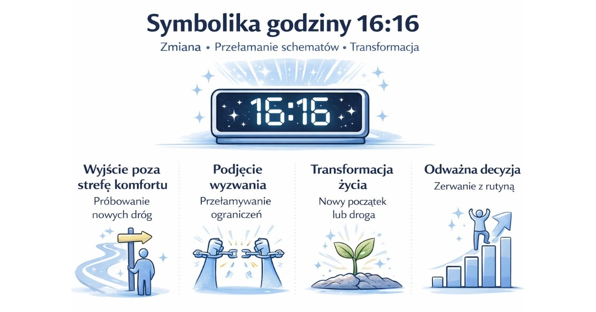 Godzina 16:16 należy do tzw. godzin lustrzanych, czyli momentów, w których cyfry po obu stronach dwukropka tworzą identyczny układ. W interpretacjach symbolicznych często kojarzona jest z potrzebą zmiany kierunku działania, przełamaniem rutyny lub rozpoczęciem nowego etapu w życiu.
