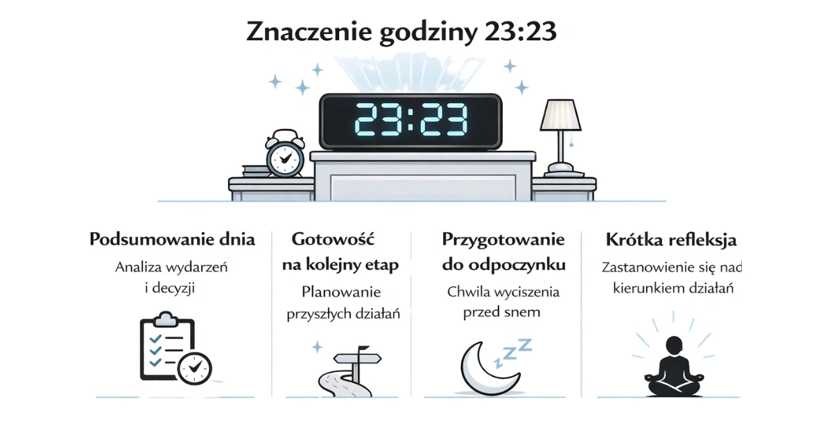 W tym kontekście godzina 23:23 bywa interpretowana jako moment refleksji pod koniec dnia – chwila, w której można symbolicznie zamknąć minione wydarzenia i przygotować się na nowy etap lub nową decyzję.