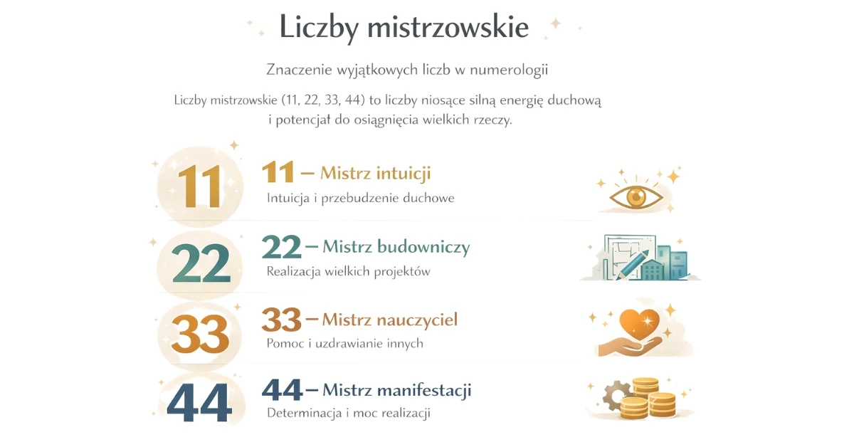 Liczby mistrzowskie, takie jak 11, 22 czy 33, są w numerologii traktowane jako szczególne wartości symboliczne. Według interpretacji numerologicznych mają one wskazywać na większy potencjał rozwoju duchowego lub szczególne predyspozycje w określonych dziedzinach życia.