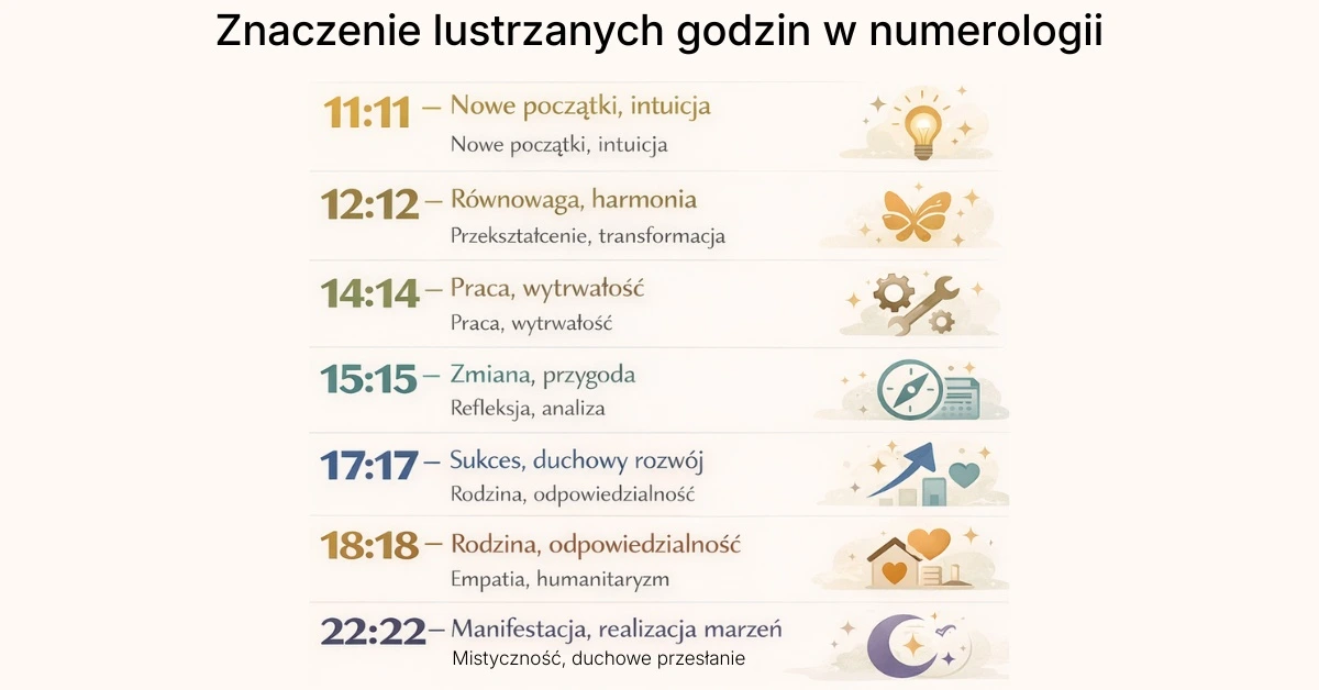 Infografika ilustrująca numerologiczne znaczenie najważniejszych lustrzanych godzin