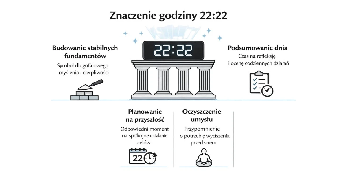 W interpretacjach numerologicznych godzina 22:22 bywa kojarzona z budowaniem stabilności, cierpliwością oraz potrzebą uporządkowania pewnych obszarów życia. Wieczorna pora tej godziny sprzyja także refleksji nad tym, co wydarzyło się w ciągu dnia oraz nad kierunkiem, w którym zmierzają nasze działania.