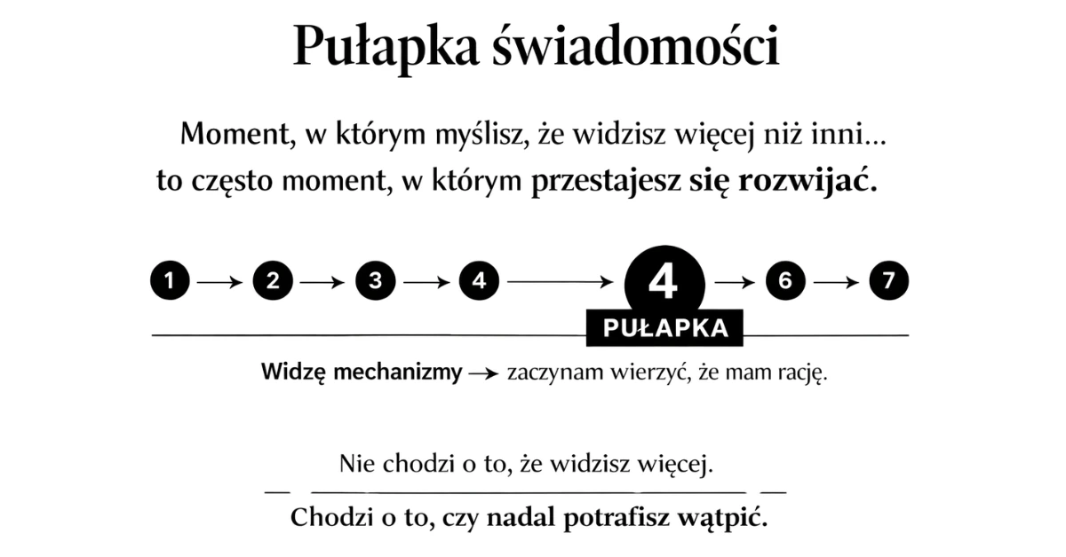 To jeden z najbardziej zdradliwych momentów. Pojawia się zwykle wtedy, gdy zaczynasz dostrzegać mechanizmy – manipulację, schematy, wpływ emocji i narracji. Nagle wiele rzeczy zaczyna mieć sens. I bardzo łatwo wtedy pomyśleć: „widzę więcej niż inni”.