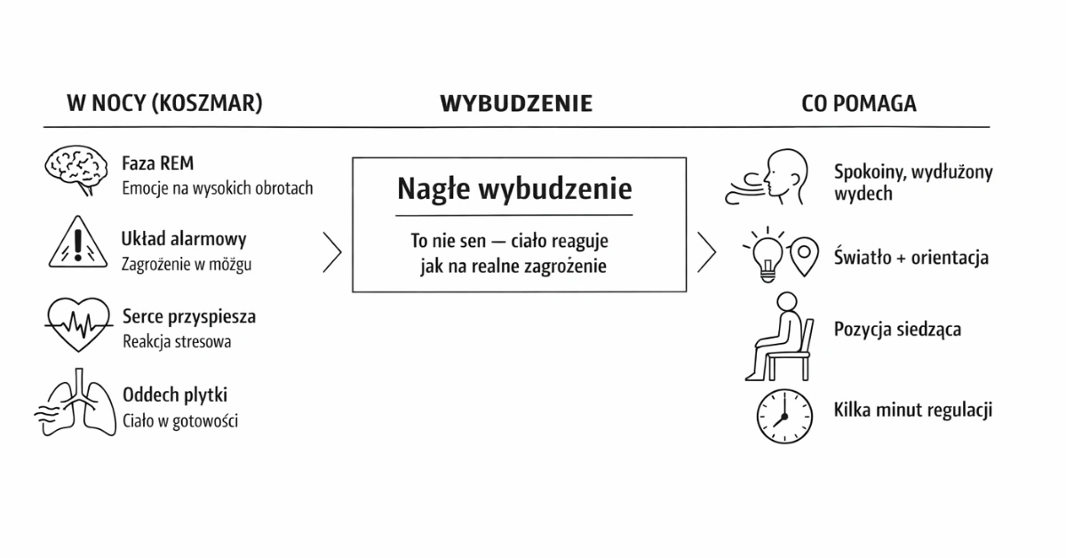 Podczas koszmaru aktywuje się układ współczulny: przyspiesza tętno, oddech, rośnie napięcie mięśniowe. Dlatego ciało reaguje tak, jakby zagrożenie było realne – mimo że źródłem bodźca jest wyłącznie sen.