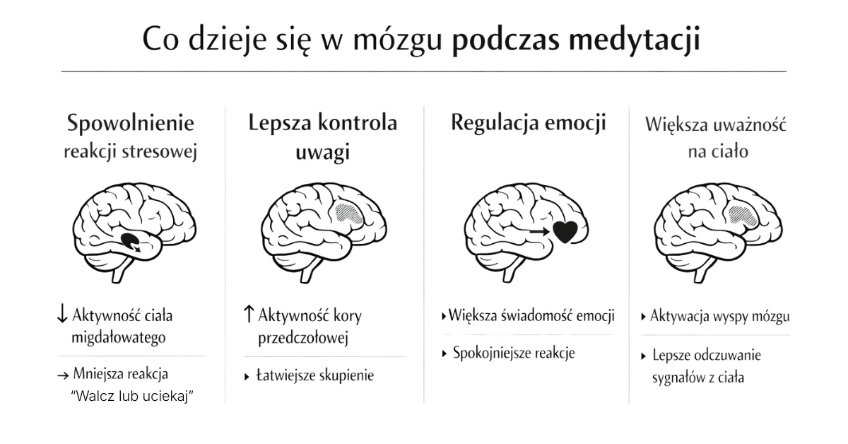 Medytacja uczy zauważania, kiedy uwaga odpływa, i spokojnego kierowania jej z powrotem do wybranego punktu — najczęściej oddechu, ciała lub mantry. Dzięki temu może wspierać koncentrację i większą świadomość własnych procesów poznawczych. W niektórych badaniach opisywano także zmiany dotyczące funkcjonowania obszarów mózgu związanych z uwagą, takich jak kora przedczołowa czy prawa wyspa przednia, odpowiedzialnych m.in. za uwagę i przetwarzanie sensoryczne.