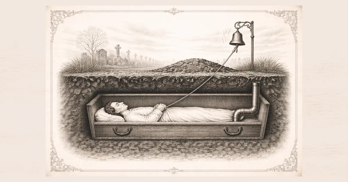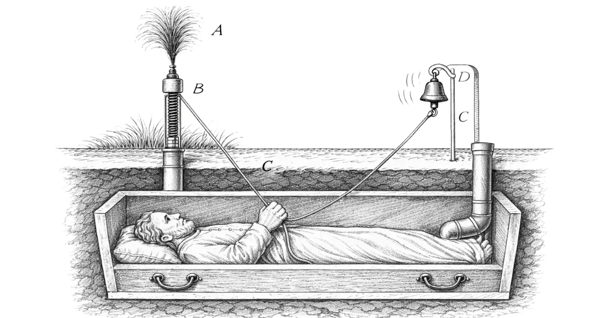 Jeszcze 200 lat temu ludzie bardziej bali się jednego scenariusza niż samej śmierci. Tego, że zostaną uznani za martwych zbyt wcześnie. W odpowiedzi na ten lęk zaczęto tworzyć specjalne trumny z systemami ratunkowymi. Najprostszy z nich polegał na tym, że do ręki zmarłego przywiązywano sznurek, którego drugi koniec wychodził nad powierzchnię ziemi. Jeśli ktoś się obudził, mógł poruszyć dłonią i uruchomić dzwonek. Teoretycznie wystarczyło, by zostać uratowanym.