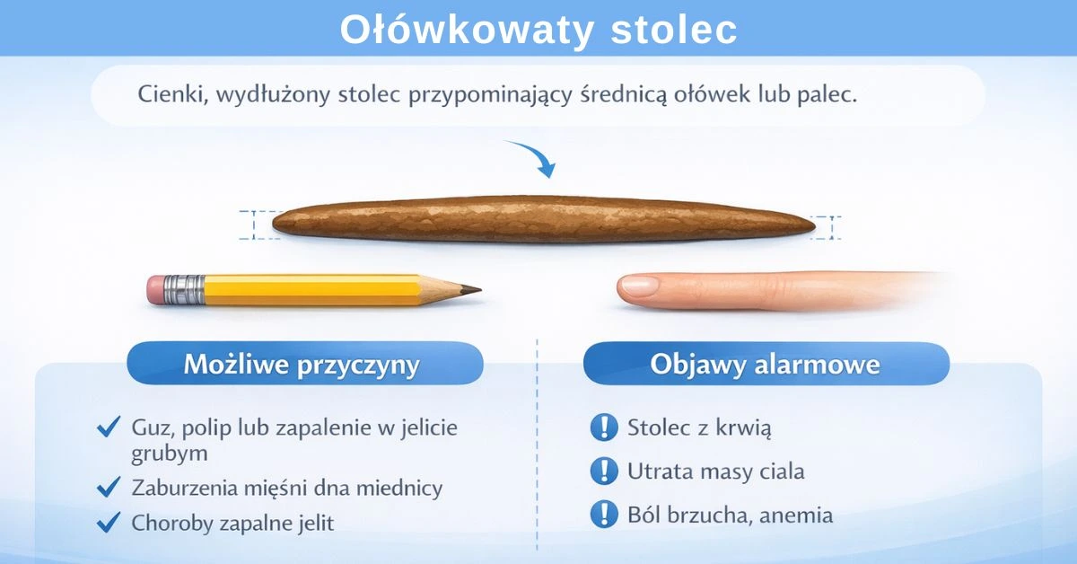 Niepokój diagnostyczny budzi natomiast utrwalony, powtarzający się ołówkowaty stolec, zwłaszcza jeśli towarzyszą mu inne objawy ze strony przewodu pokarmowego. Taki obraz może sugerować: